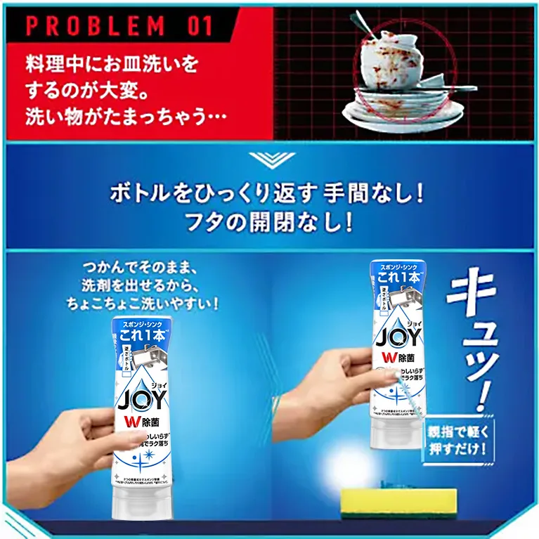 お掃除2025/04/24冬でもキレイな手元で日本初 ジョイ“めちゃ楽 逆さボトル”誕生ジョイ“めちゃ楽 逆さボトル”なら、キュッ!パッ!トン!で、瞬間洗い出しを可能に。キュッ!と押すだけボトルをひっくり返す手間なし!蓋の開閉なし!パッ!と離すだけ液だれなしで、瞬時に止まる!最後の1滴まで使える新形状ボトル簡単に使えて、終わったら置くだけのめちゃ楽ボトル。注意:必ずジョイボトルに入れ替えて、ジョイ詰め替え用を使用してください。